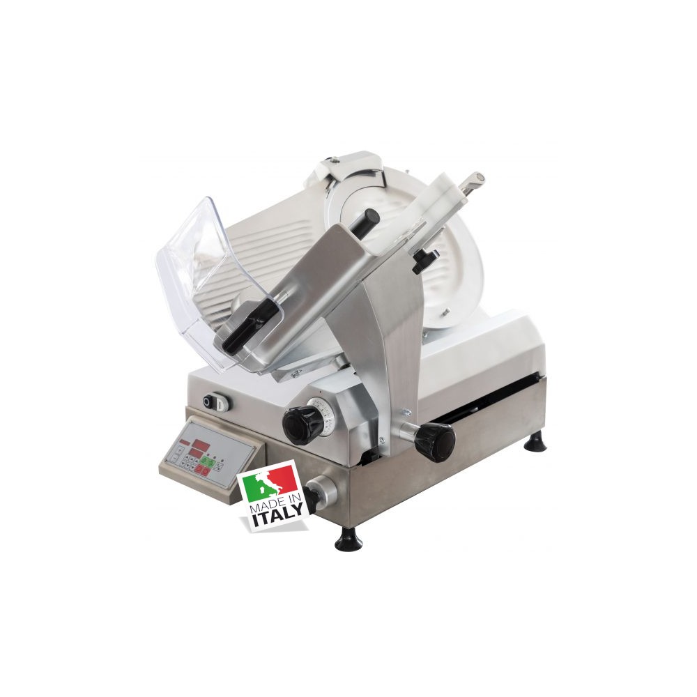 costruita in lega di alluminio trattato con ossidazione anodica. Il basamento per l’automazione della macchina è in acciaio inox ed è caratterizzato da un dispositivo conta fette. il movimento del carrello è automatico a velocità fissa e corsa variabile. Viene montata di serie una lama di terza generazione per taglio salumi e formaggi, regolatore dello spessore di taglio da 0 a 16 è molto sensibile e permette una regolazione decimale