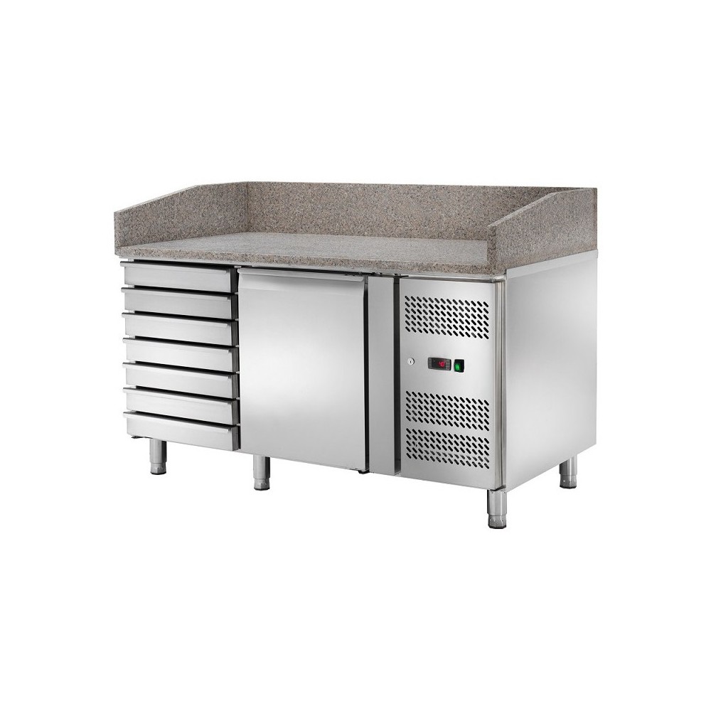 • Struttura in acciaio inox. • Top in granito. • Alzatina 20 cm in granito. • Refrigerazione ventilata con evaporatore ad alette trattato anticorrosione. • Ricircolo aria fredda. • Gruppo refrigerante incorporato estraibile. • Centralina digitale. • Cornice di battuta delle porte riscaldata anti-condensa. • Evaporazione automatica dell’acqua di condensa. • Spessore isolamento 60 mm. • Guarnizioni magnetiche facilmente estraibili. • Cella con angoli arrotondati. • Chiusura vano tecnico con chiave. • Pannelli esterni di fondo e posteriore in acciaio galvanizzato. • Piedini regolabili in acciaio inox.