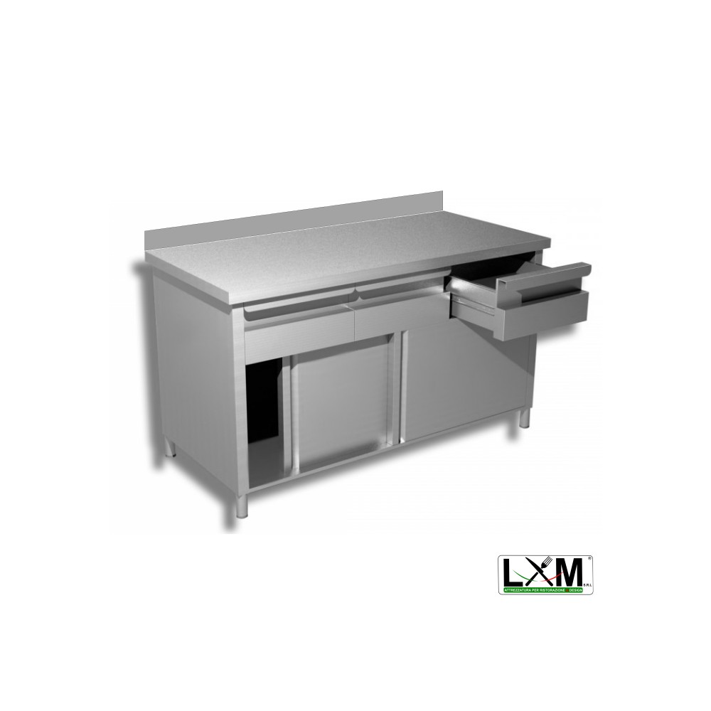 Tavolo da lavoro in acciaio inox con porte scorrevoli,cassettiera orizzontale e alzatina prof. 70 cm