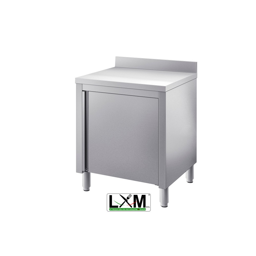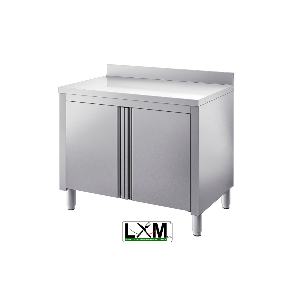 Tavolo da lavoro in acciaio Inox con porte a battente e alzatina prof. 60 cm
