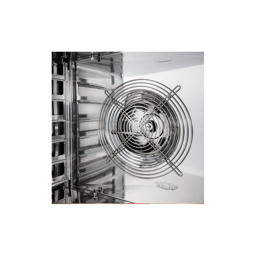 6 Teglie - 600x400 mm / 6 - GN 1/1 | Distanza teglie 80 mm | Dimensioni Camera 680 x 480 x 520 mm | Dimensioni esterne 840 x 920 x 835 mm | Potenza 7,65 kW 220V/380V | Peso 110 kg | PORTA A BANDIERA SX o DX