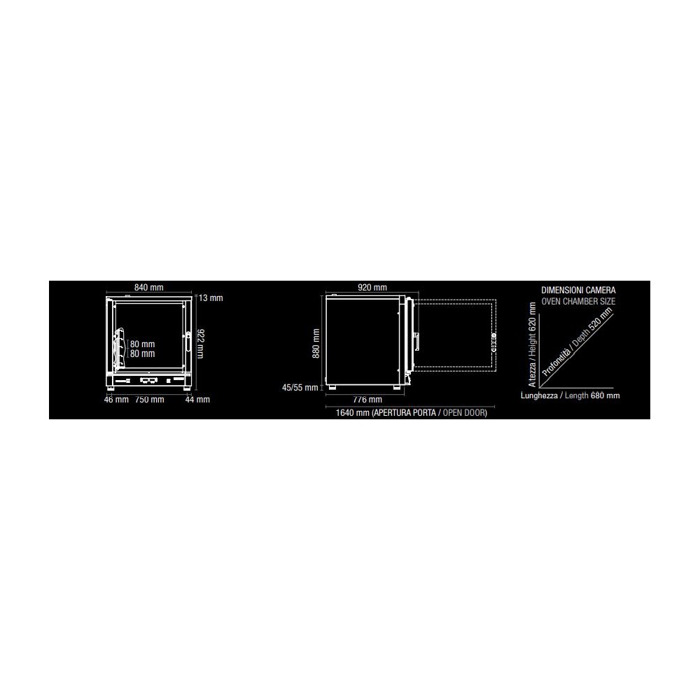 7 Teglie - 600x400 mm / 7 - GN 1/1 | Distanza teglie 80 mm | Dimensioni Camera 680 x 520 x 620 mm | Dimensioni esterne 840 x 920 x 935 mm | Potenza 10,7 kW 220V/380V | Peso 130 kg | PORTA A BANDIERA SX