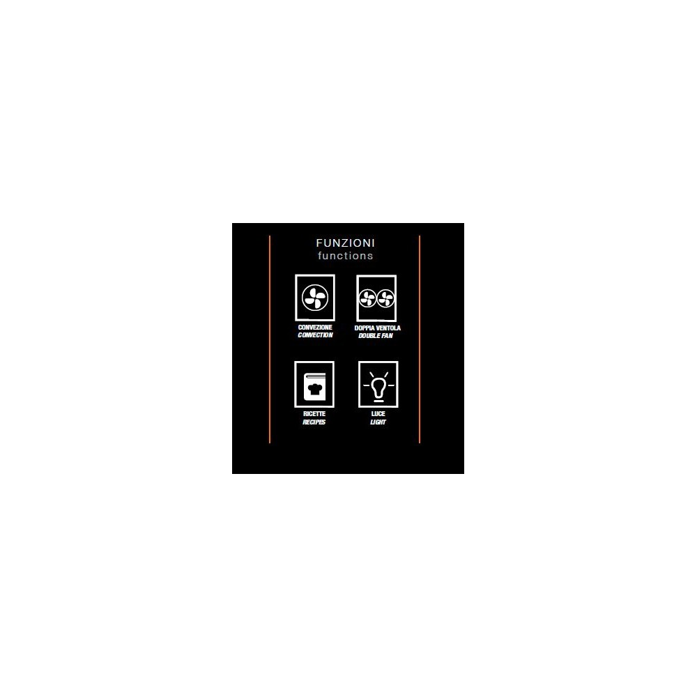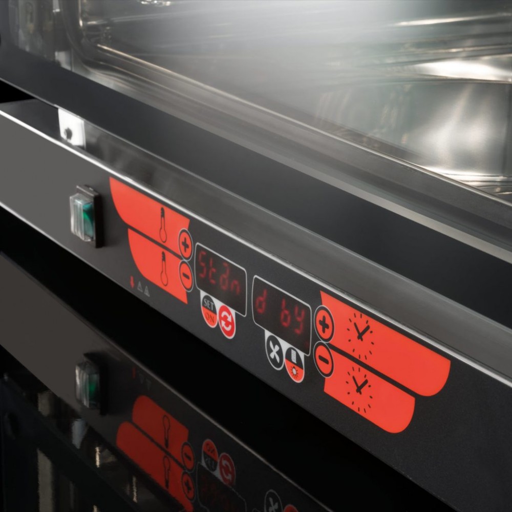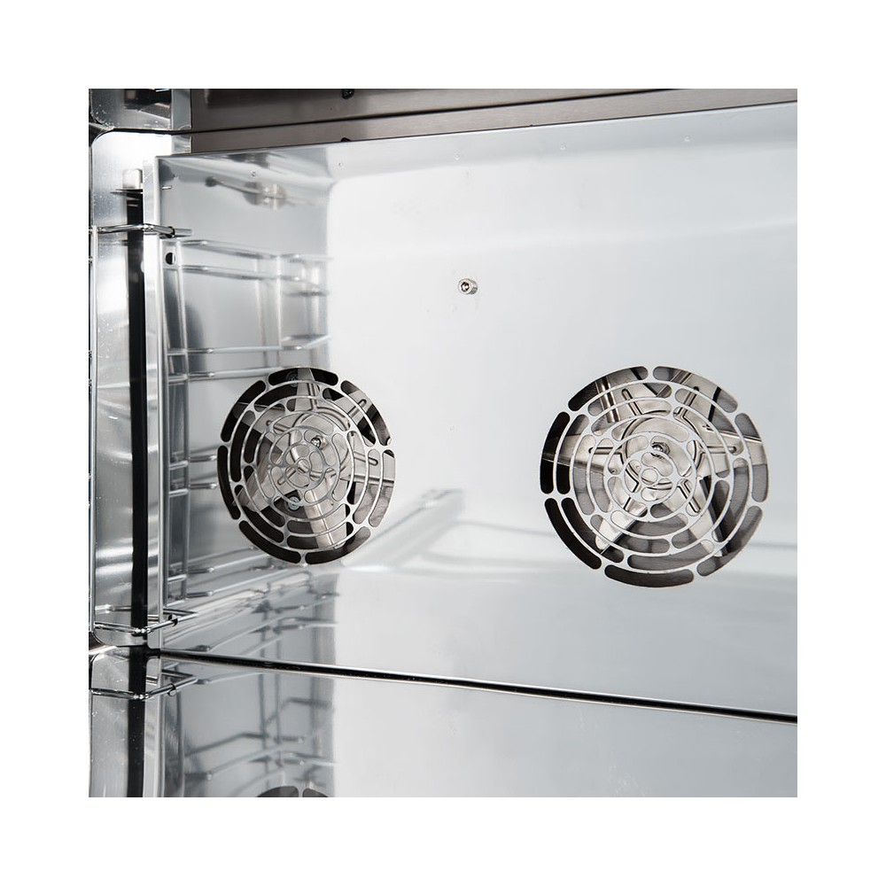 3 teglie o griglie 600 x 400 mm o GN 1/1 | Distanza teglie 105 mm | Dimensioni Camera 650 x 478 x 350 mm | Dimensioni esterne 780 x 795 x 560 mm | 3,66 kW 220V | Peso 55 kg