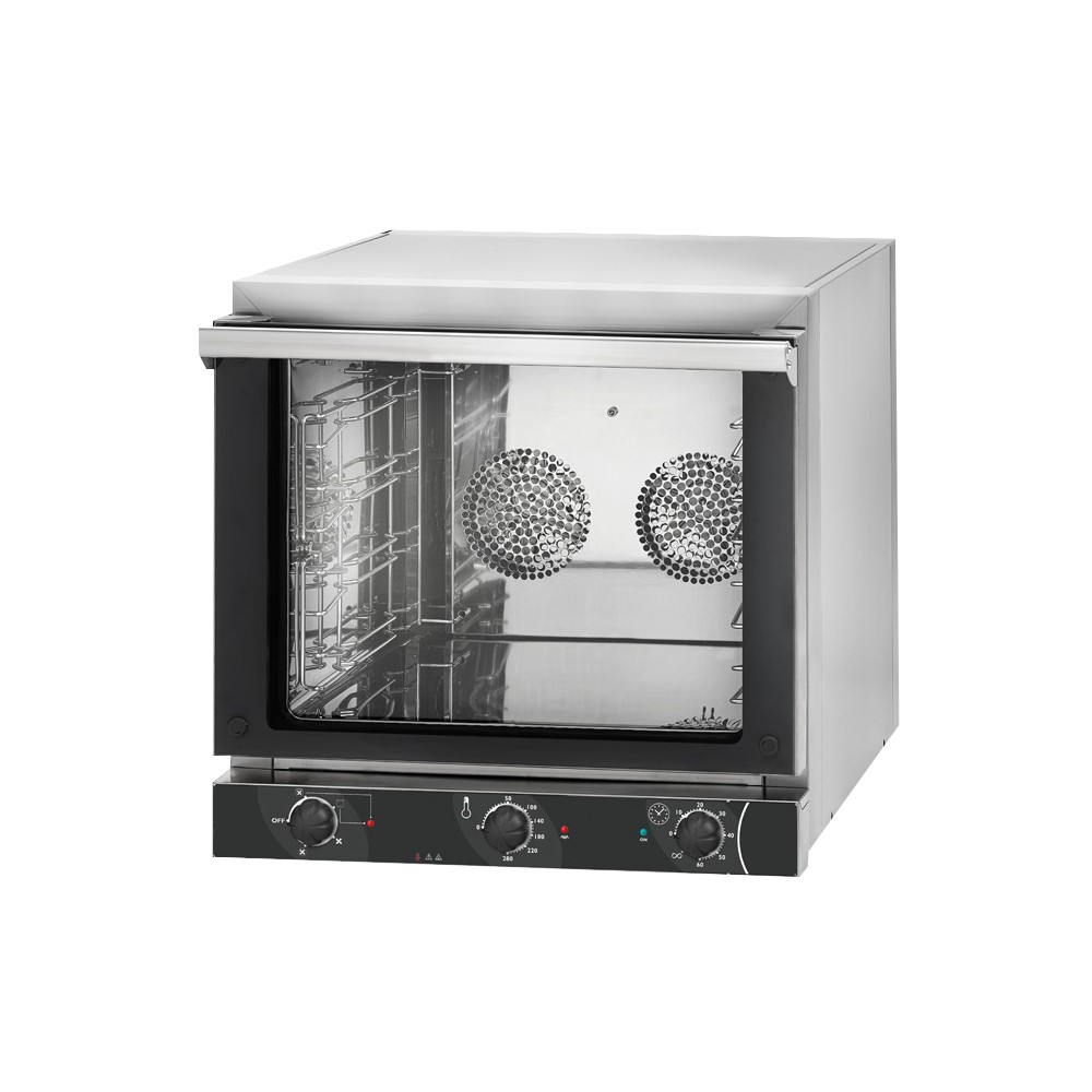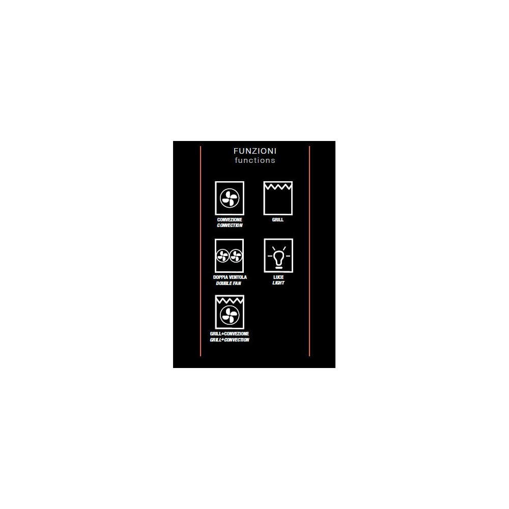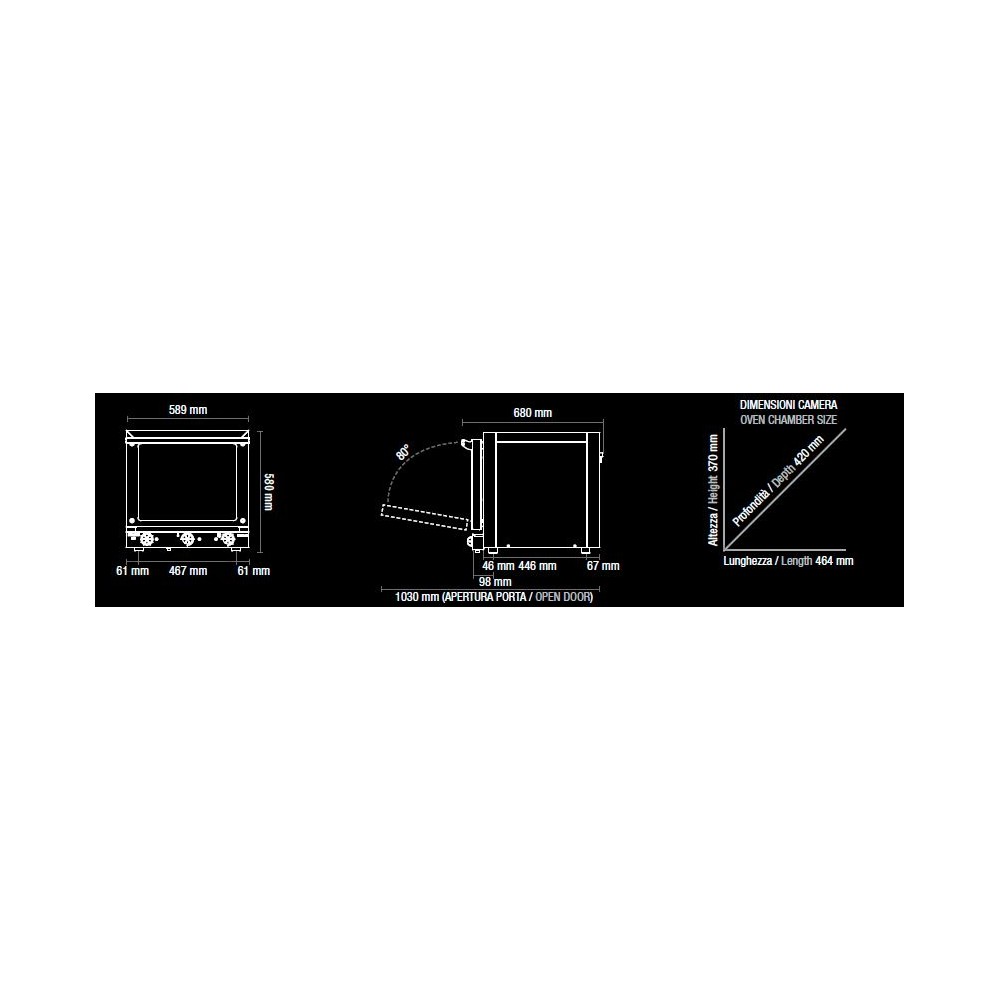 4 - 435x350 mm / 435x320 mm | Distanza teglie 84 mm | Dimensioni Camera 464 x 420 x 370 mm | Dimensioni esterne 589 x 680 x 580 mm |3,15 kW / 1,7 kW Grill 220V | Peso 45kg