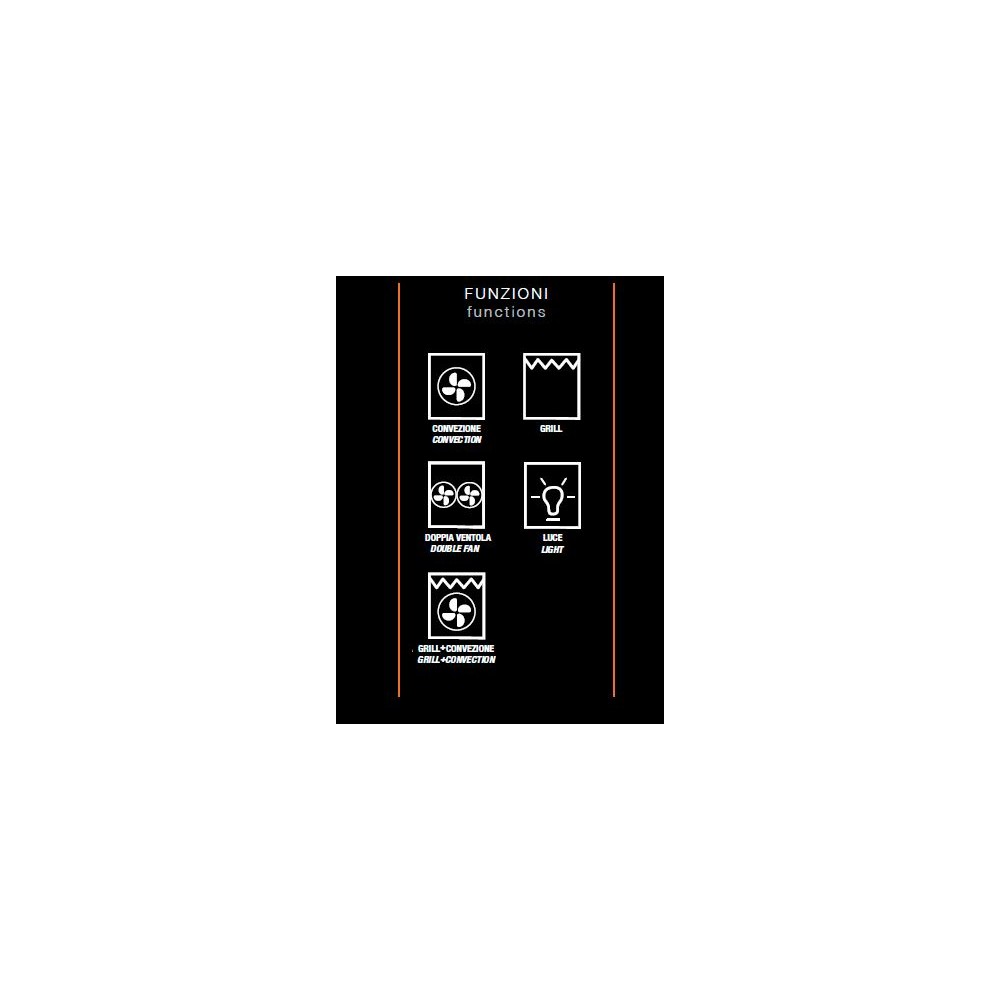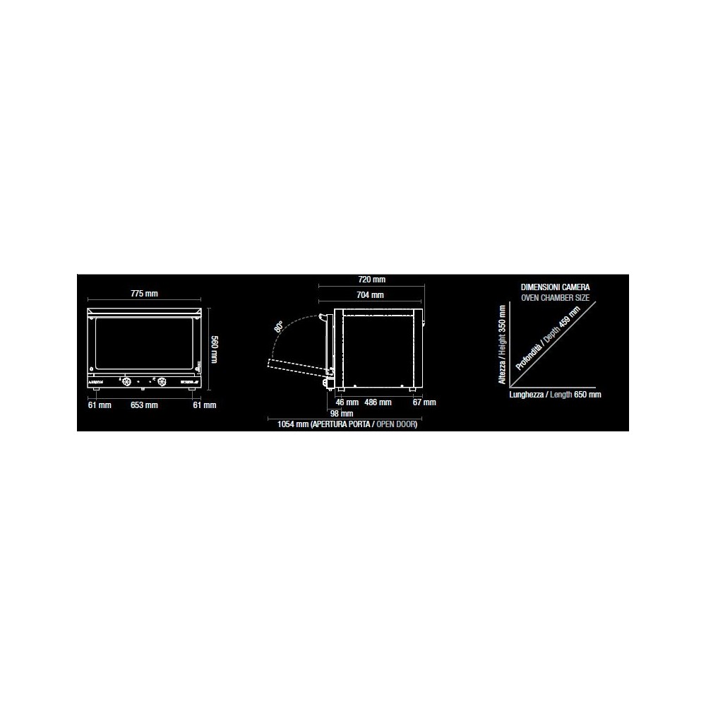 3 - 600 x 400 mm | Distanza teglie 105 mm | Dimensioni Camera 650 x 459 x 350 mm | Dimensioni esterne 775 x 720 x 560 mm | 3,15 kW / 1,7 kW Grill 220V | Peso 55 kg