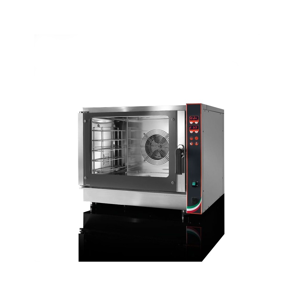 Porta a SX | 5 teglie o griglie 600x400 mm o GN 1/1 | Distanza teglie 75 mm | 660 x 450 x 440 mm | Dimensioni esterne 920 x 840 x 760 mm | 6,45 kW 220-240V / 380-415V 3/3 +N 50/60 Hz | Peso 115 kg