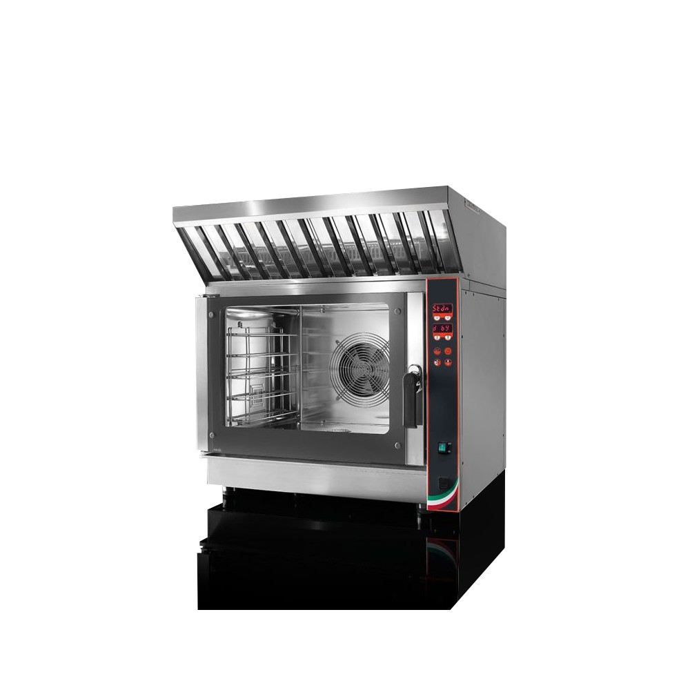 Porta a SX | 5 teglie o griglie 600x400 mm o GN 1/1 | Distanza teglie 75 mm | 660 x 450 x 440 mm | Dimensioni esterne 920 x 840 x 760 mm + 300 mm cappa | 6,45 kW 220-240V / 380-415V 3/3 +N 50/60 Hz | Peso 115 kg