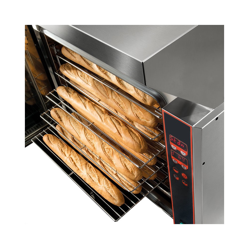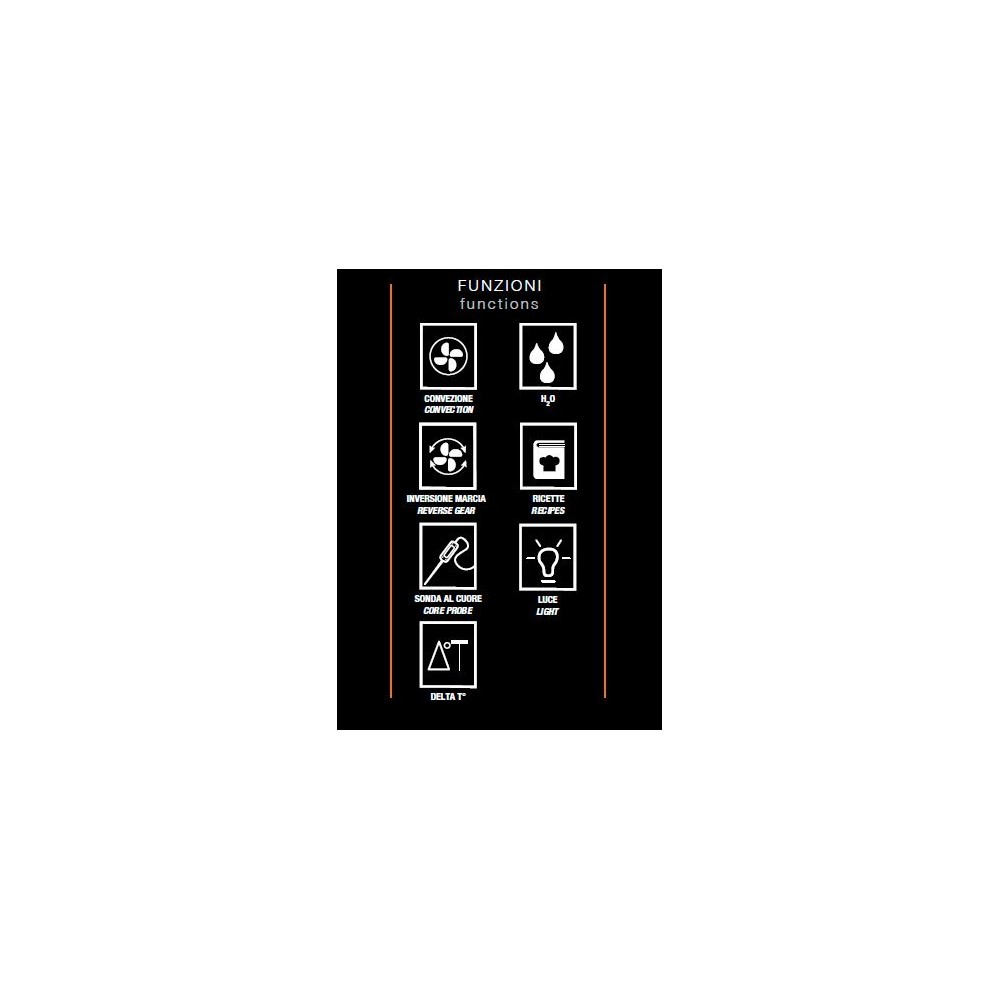 - Camera di cottura in acciaio inox con angoli arrotondati. Stainless steel coocking room. - Alimentazione elettrica per collegamento 220-240V / 380-415V / 3/3+N / 50/60 Hz. Power supply for connection 220-240V / 380-415V / 3/3+N / 50/60 Hz. - Interruttore 0/1 per lo spegnimento totale ed interruzione alimentazione principale. Switch 0/1 for total shutdown and main power disconnection. - Illuminazione interna con lampade alogene. Internal lighting with halogen lamps. - Ventola con funzionamento a senso alternato, regolabile in velocità. Fan speed-adjustable with alternating direction operation. - Scheda elettronica di facile utilizzo con display laterale sul lato destro del forno. Electronic board with user-friendly side display on the right side of the oven. - Griglia forata per foro di scarico, removibile per una facile pulizia. Perforated grid for drain hole, removable for easy cleaning.