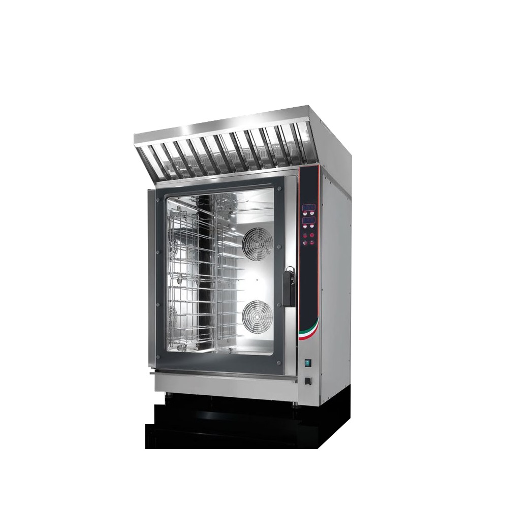 Porta a SX | 10 teglie o griglie 600x400 mm o GN 1/1 | Distanza teglie 75 mm | 660 x 455 x 840 mm | Dimensioni esterne 920 x 840 x 1160 mm + 300 mm cappa | 12,7 kW 220-240V / 380-415V 3/3 +N 50/60 Hz | Peso 150 kg