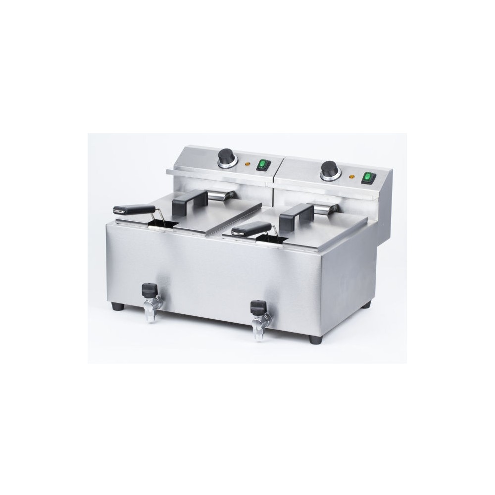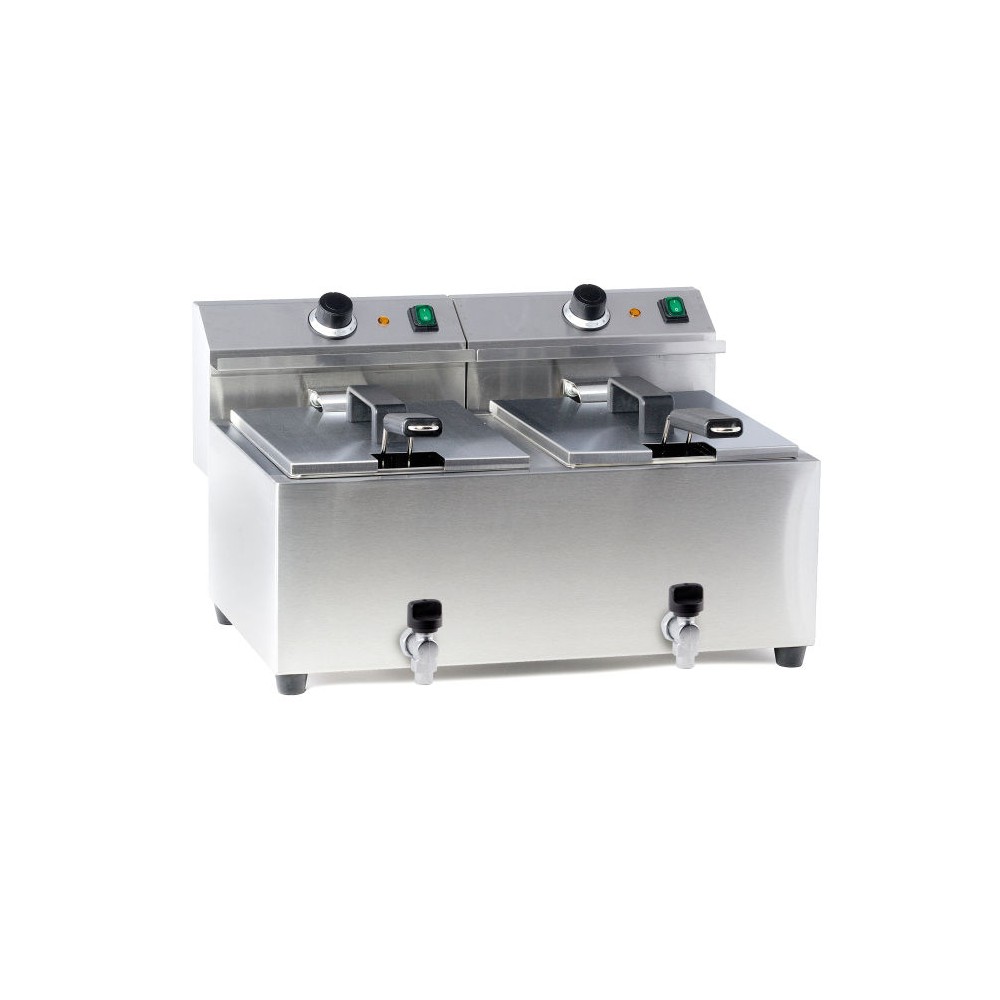 In acciaio 18/0 Resistenza removibile con una funzione di disinserimento quando estratta. Contenitore a V per migliore zona fredda. Il pannello di controllo delle temperature e la luce di controllo si trovano in cima alla friggitrice. Un termostato di sicurezza previene la friggitrice dal surriscaldamento e può essere reinserito col tasto "reset", posto sotto la sezione di controllo Un cestello per friggere con un manico extra lungo, rende il modello particolarmente adatto ad un uso intensivo Tutte le friggitrici vengono fornite con cestelli e coperchi