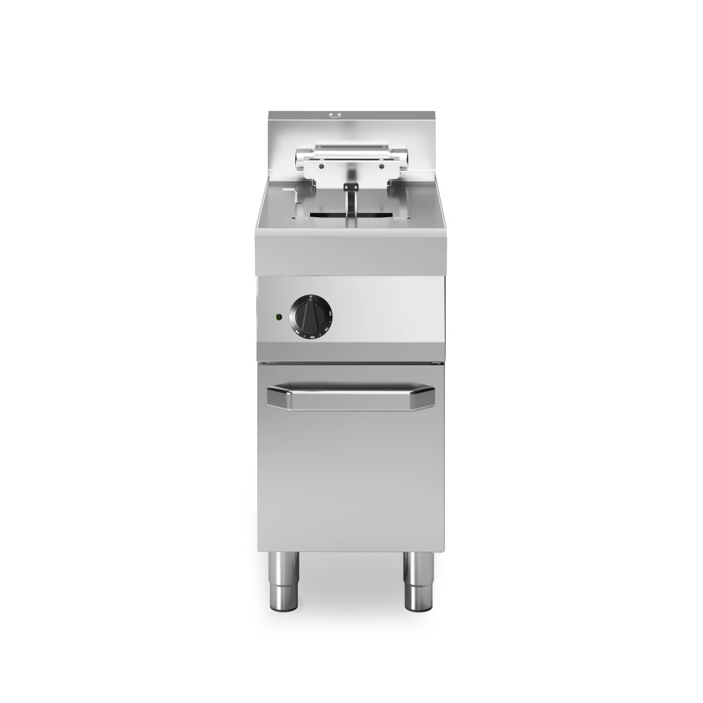 Elementi riscaldanti Resistenze corazzate ribaltabili per una miglior pulizia Manopole Realizzate in una robusta mescola di polimero termoresistente di colore nero dotate di labirinto antri trafilamento liquidi Piano Realizzato in acciaio inox AISI 304 con spessore 10/10 mm Dotazione 1 cesto vasca intera; 1 coperchio vasca; 1 filtro vasca; 1 prolunga scarico