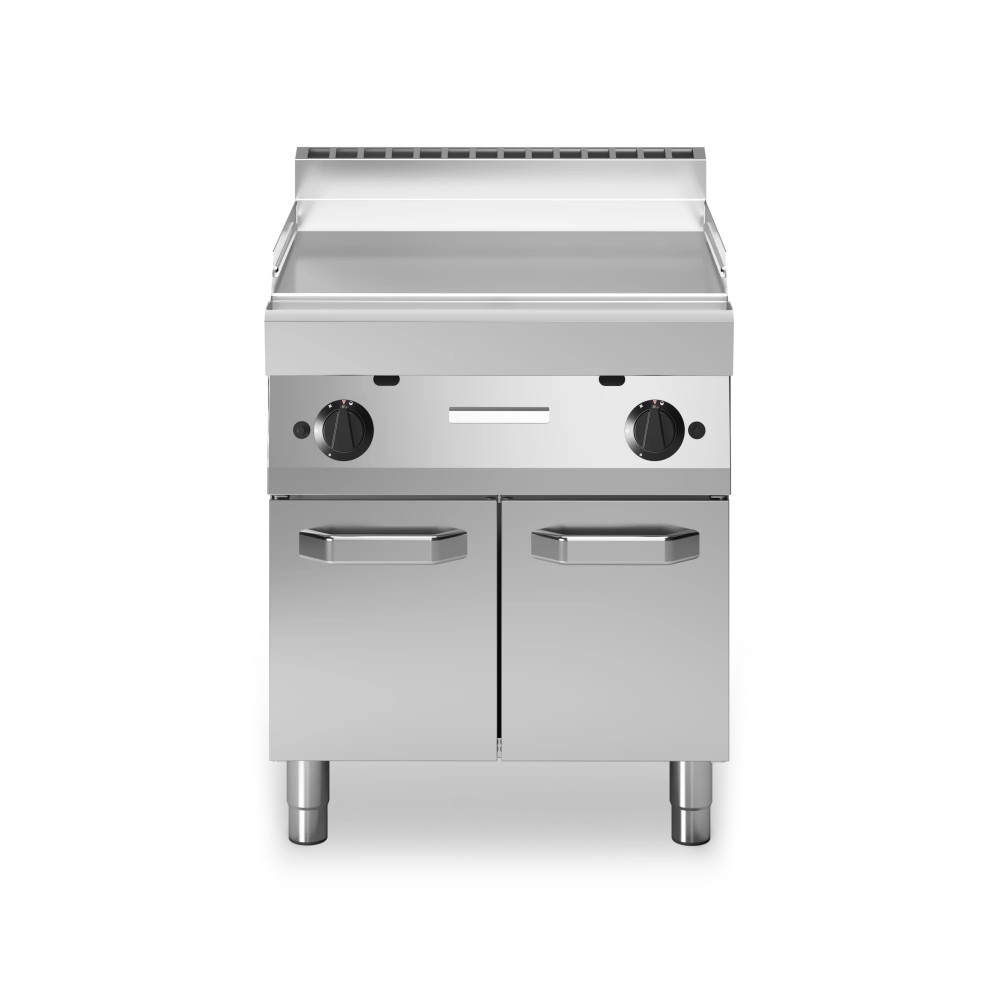 Piastra Cromata Manopole Realizzate in una robusta mescola di polimero termoresistente di colore nero dotate di labirinto antri trafilamento liquidi Maniglie Finitura alluminio spazzolato Piano Realizzato in acciaio inox AISI 304 con spessore 10/10 mm Kit Gas kit conversione da gas naturale 30/50 m/bar (collaudo con gas naturale) Materiale piastra Cromo