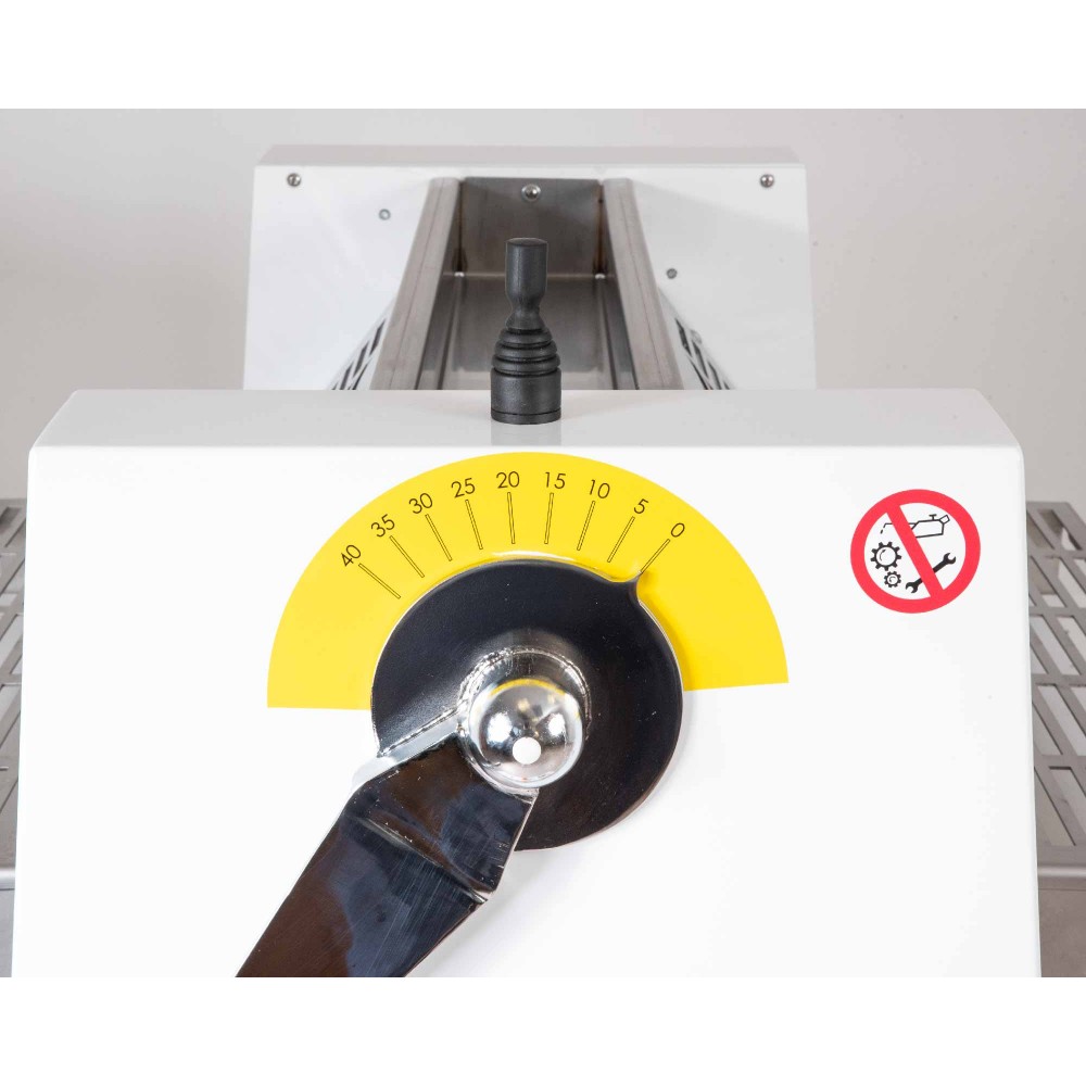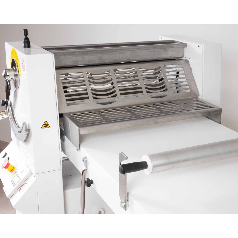 E' frutto dell’evoluzione del precedente modello, mantiene le caratteristiche di robustezza e della massima affidabilità. Trova la sua ideale locazione presso pasticcieria, hotel, ristoranti ed in piccole e medi panifici. Può lavorare tipi diversi di pasta fino a spessori molti sottili. Apertura tra cilindri laminatori da 0 a 45 mm. La struttura è in acciaio verniciato. Non vi sono parti in plastica. Dotata di protezione antinfortunistica in acciaio INOX con blocco elettrico. La sfogliatrice è fornita di: sotto piani , vaschetta raccogli farina e vasca per la farina. I tappetti trasportatori di entrata e di uscita hanno velocità diverse alternate. I piani sono sollevabili verso l’alto per un minor ingombro, oppure estraibili secondo necessità. La macchina è montata su ruote per facilitarne lo spostamento. A richiesta, la macchina è fornita di una pedaliera per una maggiore facilità nell’utilizzo.