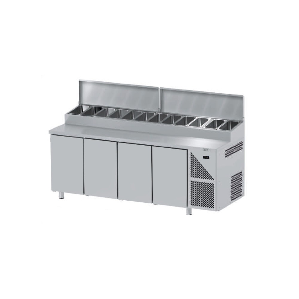La linea tavoli Snack è sinonimo di eleganza, affidabilità, robustezza e praticità d’uso. I tavoli refrigerati Snack sono caratterizzati da un piano di lavoro in acciaio inox AISI 304 con raggiatura alla base dell’alloggio vaschette per una facile e veloce pulizia. La porta è dotata di maniglia ergonomica in tutta la sua larghezza. Sul pannello comandi laterale trova alloggiamento l’apposita mascherina che ospita il controllore digitale assieme agli interruttori di accensione/spegnimento ed eventualmente all’interruttore di accensione dell’illuminazione interna. La copertura delle vaschette è disponibile con coperchio in acciaio inox oppure con vetrina. Questi tavoli sono dotati di gruppo refrigerante a “monoblocco” facilmente estraibile e tropicalizzato, l’ambiente esterno di lavoro può arrivare ad una temperatura di +40/42°C con 65% di umidità relativa. La struttura interna ed esterna è in di acciaio inox. Porte con chiusura automatica e posizione di apertura fissa a 100°, guarnizione magnetica facilmente asportabile, angoli interni arrotondati per una agevole ed ottimale pulizia. Isolamento 60mm di spessore in poliuretano iniettato ad alta pressione senza presenza di CFC o HCFC. Rilevazione delle temperature mediante sonde NTC. Refrigerazione ventilata con gas R134a. Sbrinamento automatico ed evaporazione dell’acqua di condensa mediante serpentina di acciaio inox AISI 316L. Guide e cremagliere porta griglie regolabili ed estraibili. Piedini in acciaio inox regolabili in altezza (ruote a richiesta). Il cavo di alimentazione è fornito standard senza spina..