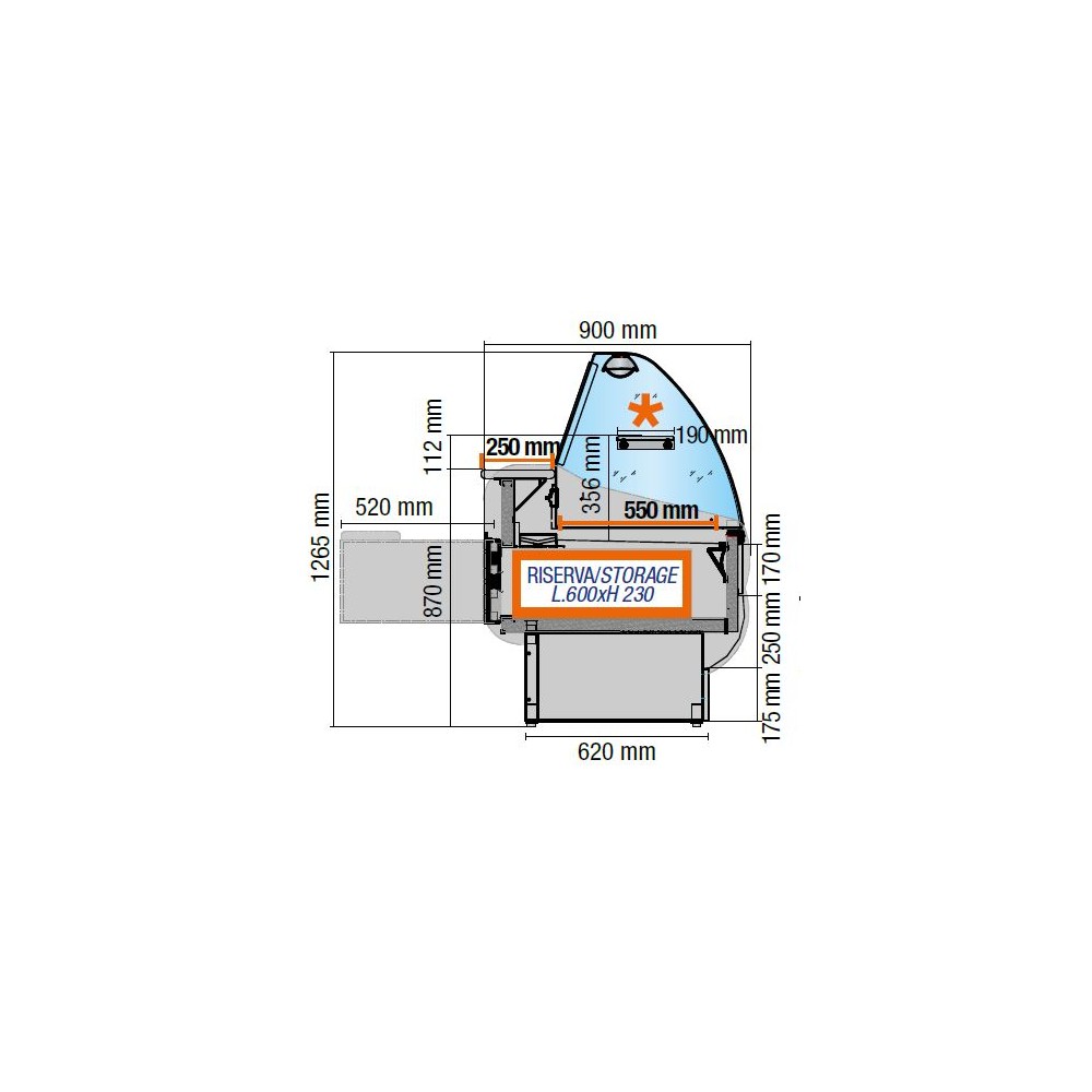 Dimensioni: Profondità 900mm Altezza 1265mm Lunghezza 1520mm  Superfice espositiva 1,26m2 | 13 Watt